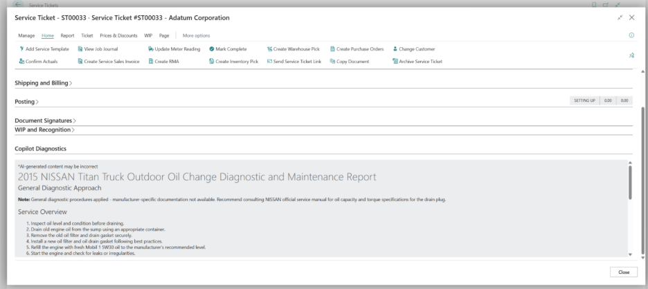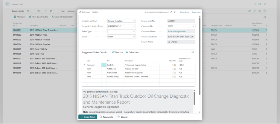Once diagnostics are generated, Copilot automatically creates complete service tickets. Suggested repair tasks, required parts, estimated labor hours, and detailed procedures are populated directly into Business Central. This not only saves you a lot of time, it also improves accuracy and ensures nothing critical is missed during ticket creation.